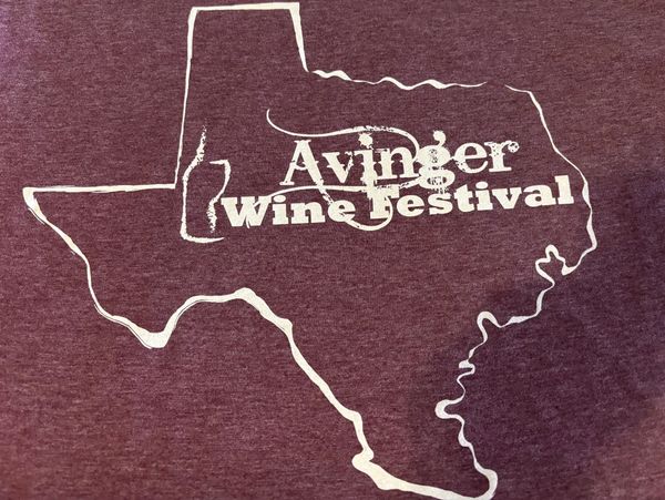 This year's Avinger Wine Festival T-shirts are on sale in Avinger at #7 Main Street, Avinger City Hall, and the Avinger Exxon!
